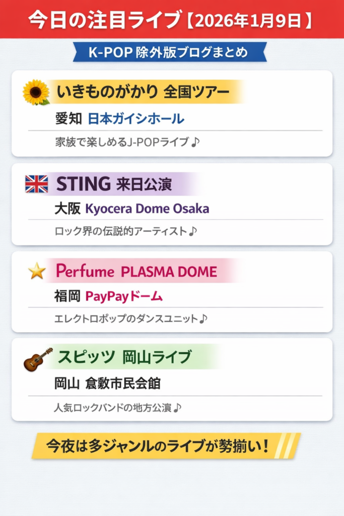 2026年1月9日、いきものがかりのライブが開催される予定で、当日の動きをチェックしている人も多いのではないでしょうか。年明けのライブということもあり、「どんな公演なのか」「今わかっている情報だけ押さえておきたい」という声も見られます。この記事では、2026年1月9日開催のいきものがかりライブについて、ネタバレなし・速報向けに、現時点で注目されているポイントを分かりやすくまとめます。