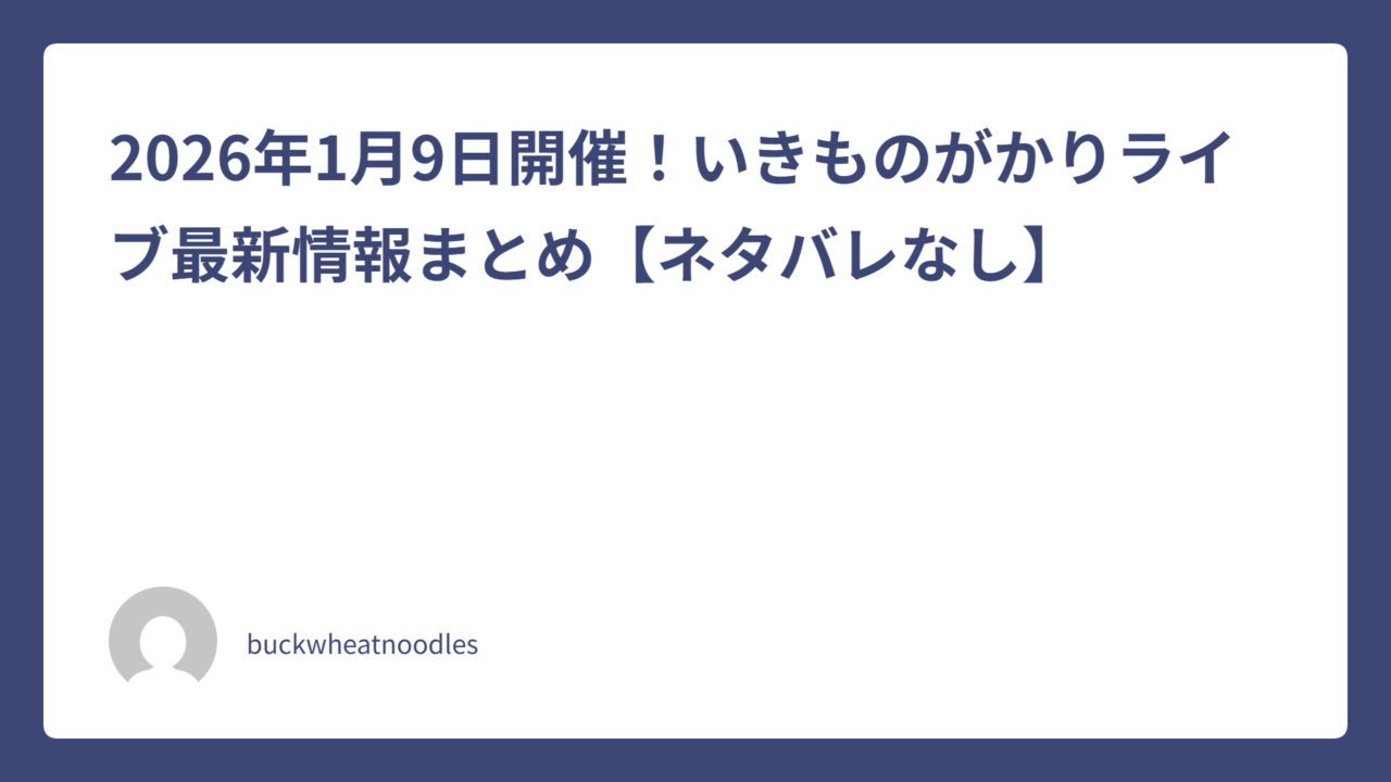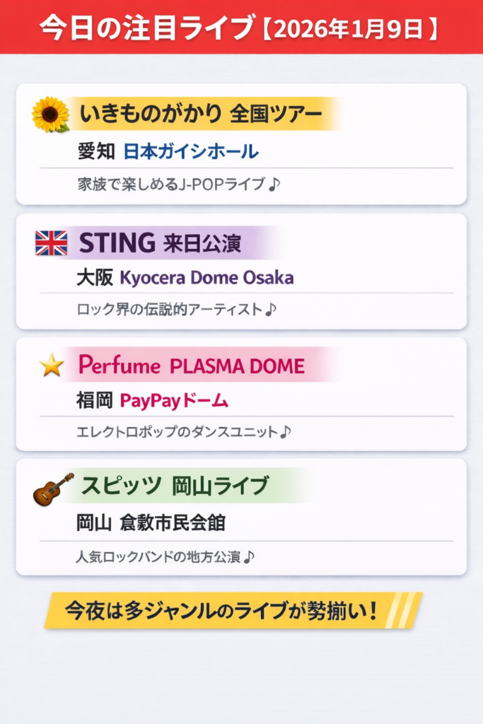 2026年1月9日、いきものがかりのライブが開催される予定で、当日の動きをチェックしている人も多いのではないでしょうか。年明けのライブということもあり、「どんな公演なのか」「今わかっている情報だけ押さえておきたい」という声も見られます。この記事では、2026年1月9日開催のいきものがかりライブについて、ネタバレなし・速報向けに、現時点で注目されているポイントを分かりやすくまとめます。